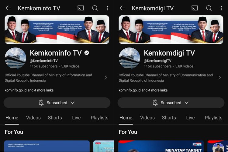 Selain akun Instagram, Kementerian Komunikasi dan Digital juga sudah menanggalkan singkatan “Kominfo” dari nama saluran YouTube.