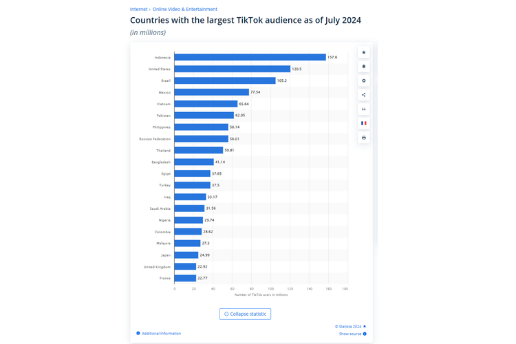 Selengkapnya, berikut daftar 20 negara dengan jumlah pengguna TikTok terbanyak di dunia per Juli 2024 menurut laporan Statista, Senin (28/10/2024).