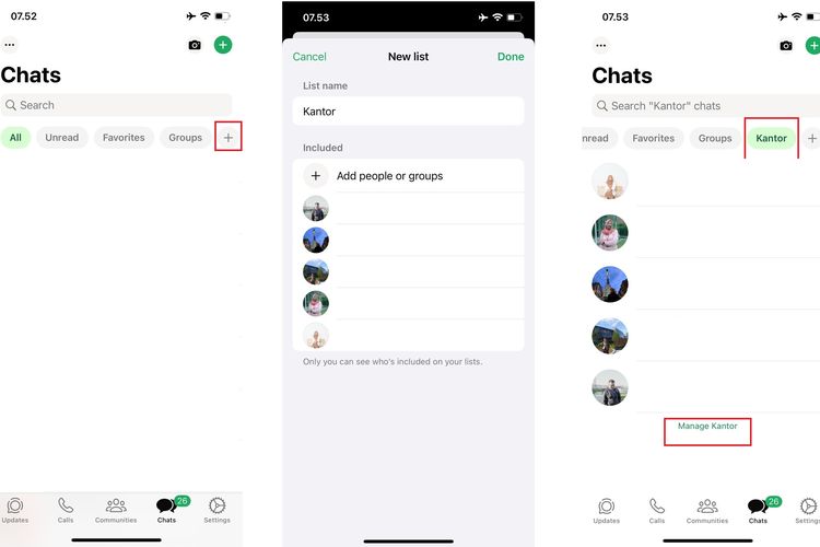 Letak tab + di WhatsApp yang baru muncul ini berada di bagian atas daftar obrolan berdampingan dengan tab-tab khusus buat filter chat. Adapun bentuk tab plus di WA adalah sebagai berikut.