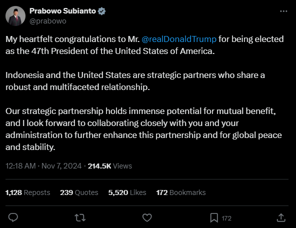 “Dan saya berharap dapat bekerja sama erat dengan Anda dan pemerintahan Anda untuk lebih meningkatkan kemitraan ini dan demi perdamaian serta stabilitas global,” tulis Prabowo.