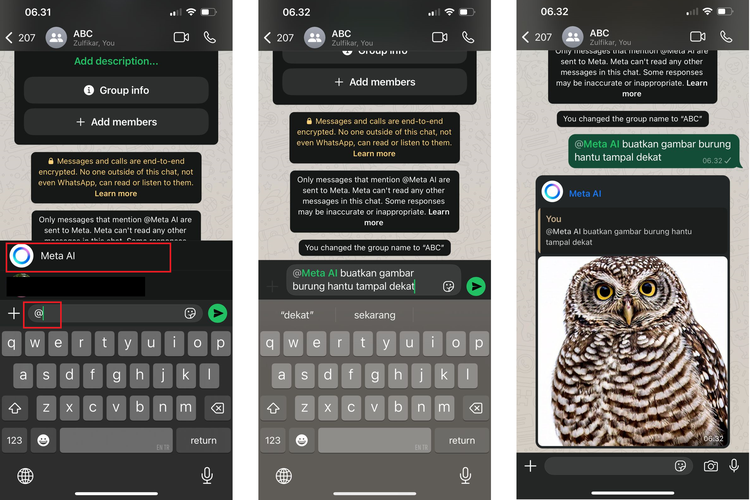 - Setelah itu, ketik “@” dan pilih “Meta AI”, lalu chatbot Meta AI akan di-mention di kolom pengetikan chat.