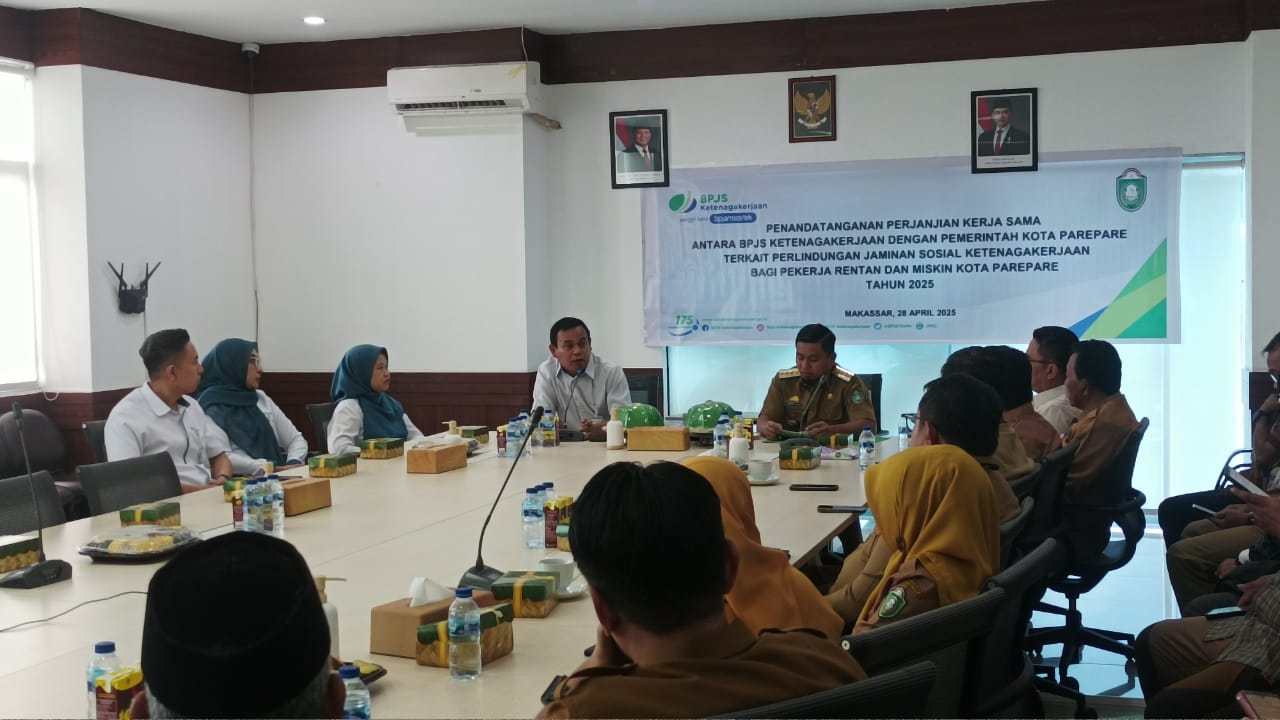 MAKASSAR, RAKYATSULBAR.COM — BPJS Ketenagakerjaan bersama Pemerintah Kota Parepare menggelar penandatanganan perjanjian kerjasama terkait perlindungan jaminan sosial ketenagakerjaan bagi pekerja rentan dan miskin di Kantor BPJS Ketenagakerjaan jl Urip Sumoharjo, Senin (28/4/25).
