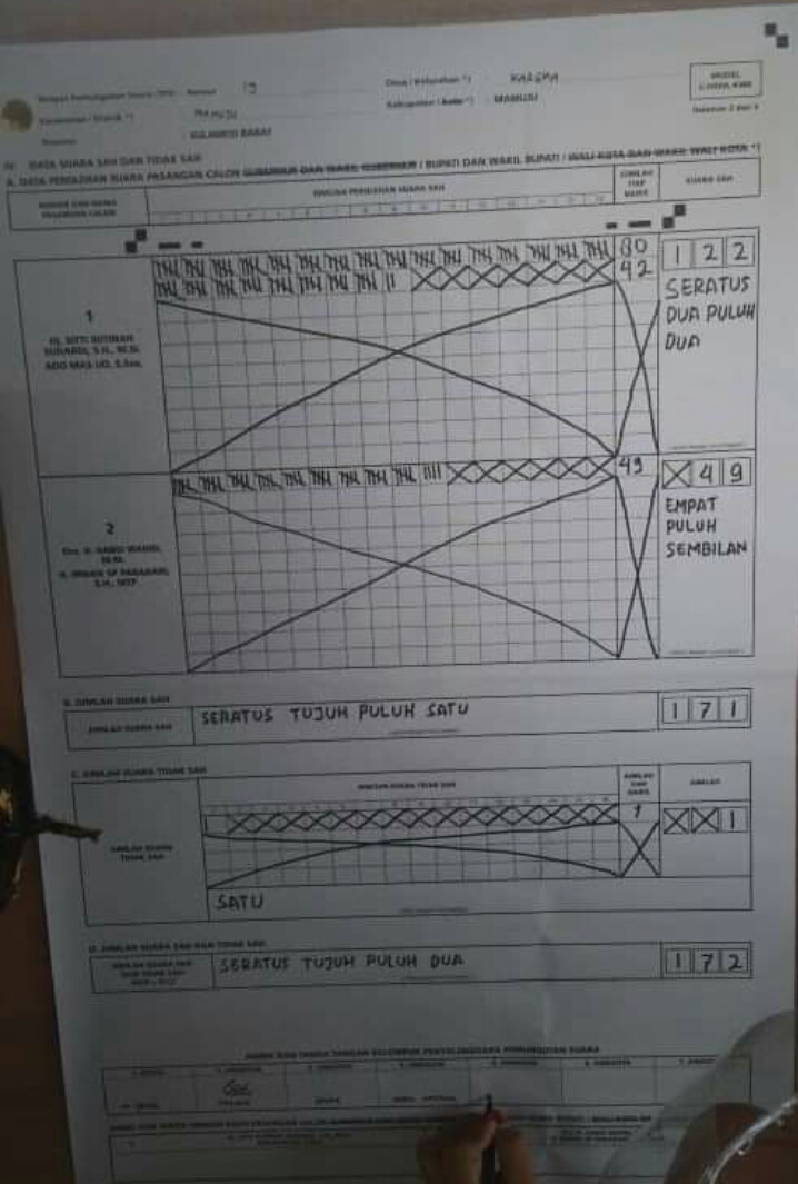 Dari hasil pemungutan Suara Ulang itu, Tina-Ado memperoleh 122 Suara, sementara Calon Nomor 2 (Habsi-Irwan) yang hanya memperoleh 49 suara, dari Total 172 pemilih yang hadir, 1 suara tidak sah.