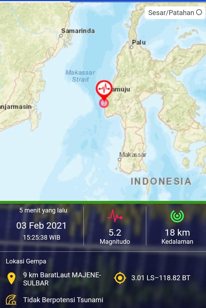 MAMUJU,RAKYATSULBAR.COM–Kejadian dan Parameter Gempabumi.Hari Rabu, 03 Februari 2021 pukul 15.25.38 WIB wilayah Selat Makassar diguncang gempa tektonik.