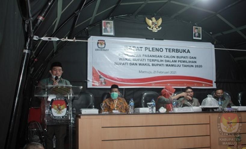 MAMUJU,RAKSUL–KPU Kabupaten Mamuju menggelar pleno penetapan pasangan calon Bupati dan Wakil Bupati terpilih hasil Pilkada Mamuju tahun 2020, Minggu 21 Februari 2021. Tenda darurat di halaman kantor KPU Provinsi Sulawesi Barat jadi tempat pelaksanaan rapat pleno penutup seluruh tahapan pelaksanaan Pilkada Mamuju tahun 2020 itu.