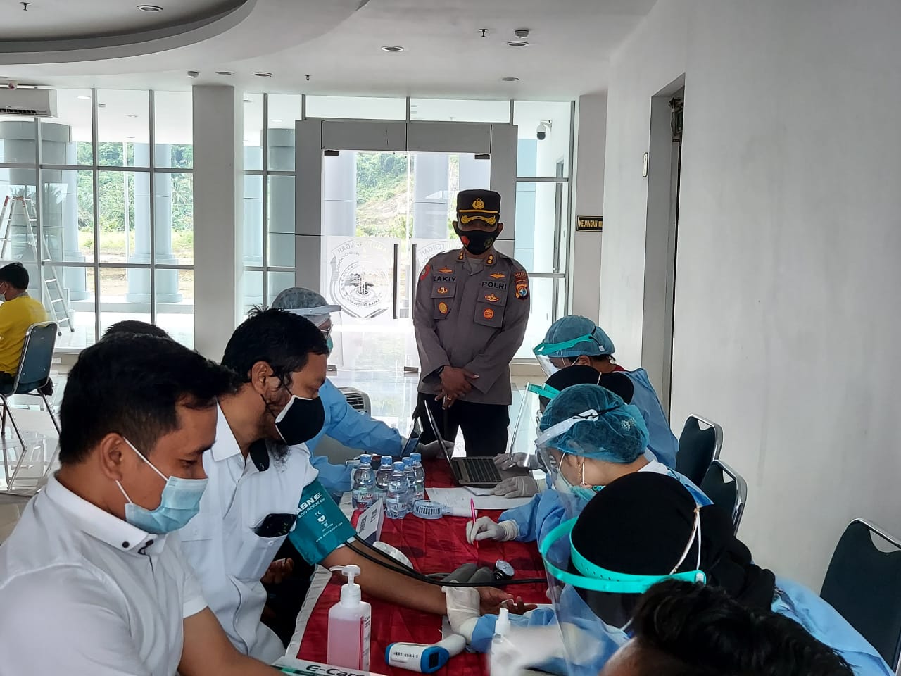 Dalam kunjungannya , Kapolres di dampingi Kabag Ops AKP Rigan Hadi Nagara, S.I.K Bersama Paur Subbag Humas IPTU Samsuddin melakukan pemantauan langsung mulai dari pintu masuk sampai ketempat observasi serta melakukan komunikasi langsung baik kepada paramedis, maupun ASN yang telah divaksin.