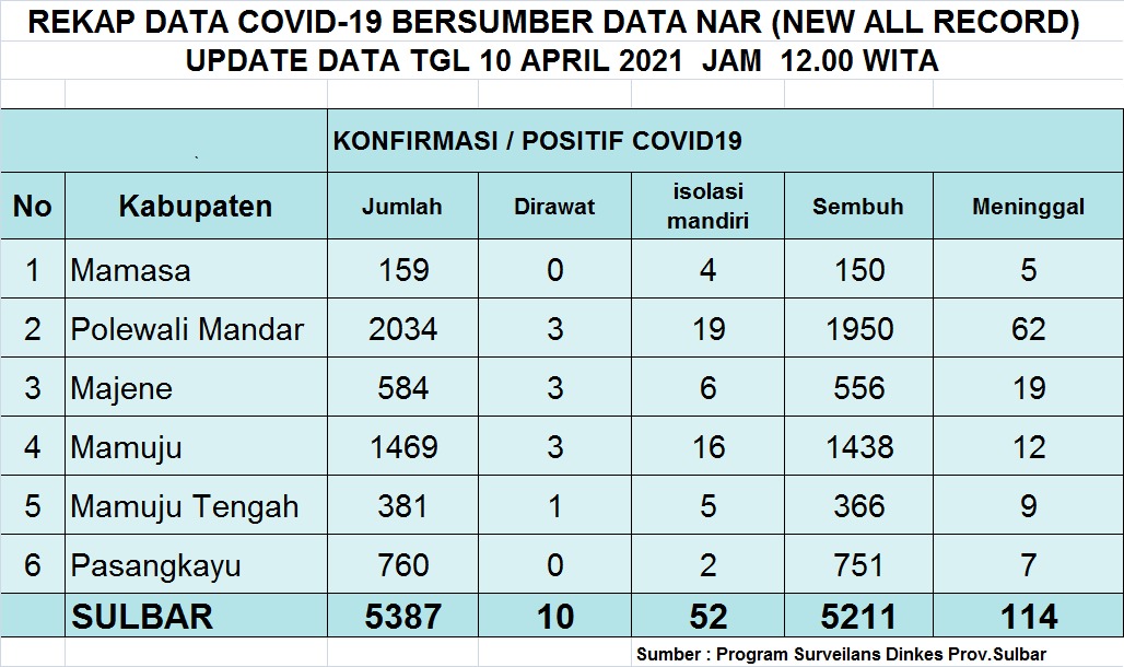 MAMUJU,RAKYATSULBAR.COM–Update data covid-19 untuk hari ini tanggal 10 APRIL 2021 sesuai dengan data NAR (New All Record) :