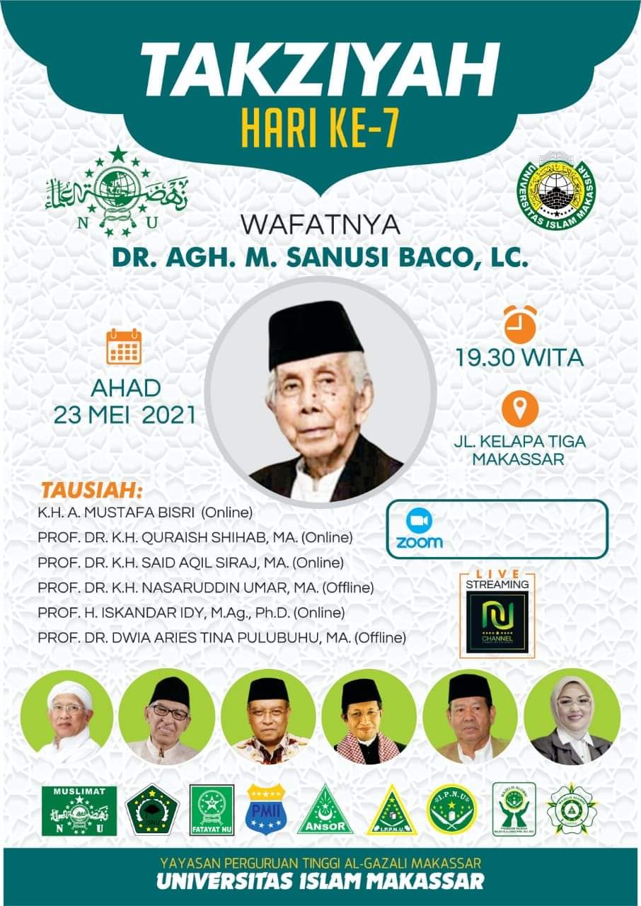 MAKASSAR,RAKYATSULBAR.COM– Universitas Islam Makassar (UIM) bersama Nahdatul Ulama (NU) akan menjadi penyelenggara Takziyah hari ketujuh wafatnya ulama khariamatik DR AGH M Sanusi Baco Lc, Ahad (23/5/2021).