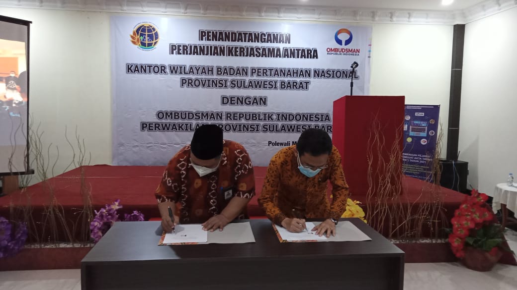 POLMAN,RAKYATSULBAR.COM--Kantor Wilayah Badan Pertanahan Nasional Provinsi Sulawesi Barat melakukan penandatangan perjanjian kerja sama dengan Ombudsman Republik Indonesia Perwakilan Sulawesi Barat