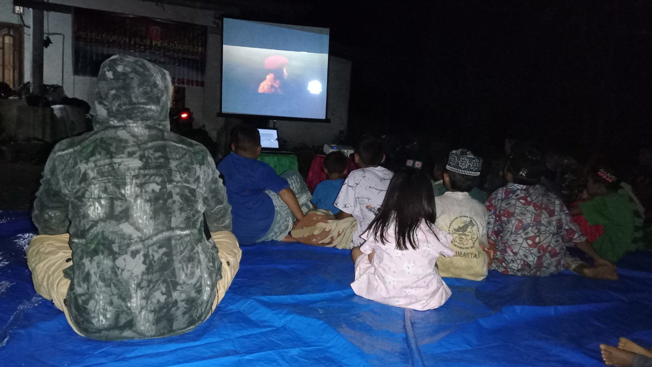 POLMAN,RAKYATSULBAR.COM- Satgas TNI Manunggal Membangun Desa (TMMD) Ke-111 Kodim 1402/Polman mengajak warga Desa Kunyi, Kecamatan Anreapi menonton film bertemakan perjuangan.