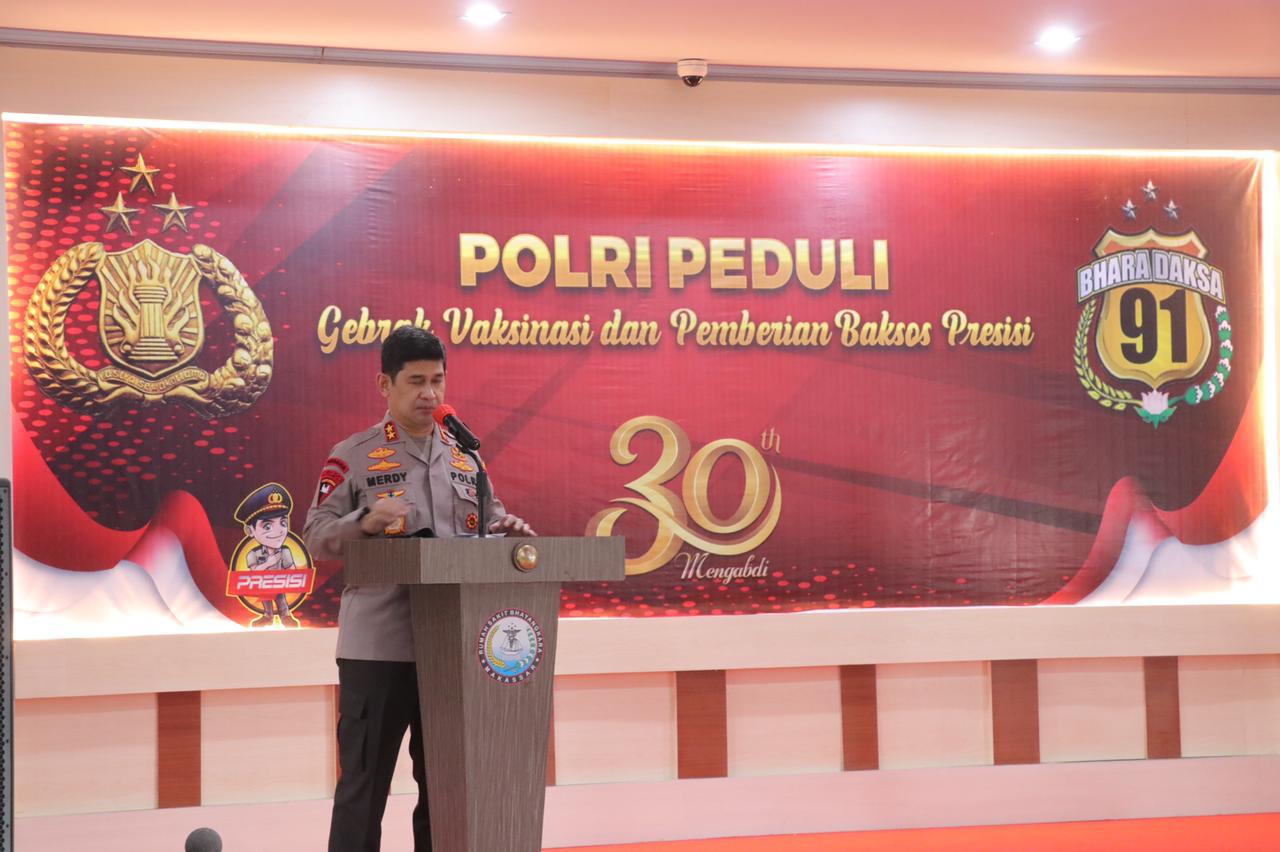 Peringatan 30 tahun pengabdian ini bertema ‘Polri Peduli Gebrak Vaksinasi dan Pemberian Baksos Presisi’. secara bersamaan,yang dibagikan oleh Batalyon Bhara Daksa di seluruh provinsi.