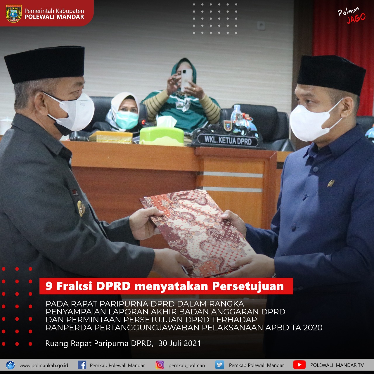 POLMAN,RAKYATSULBAR.COM— Sembilan (9) fraksi Dewan Perwakilan Rakyat Derah (DPRD)Kabupaten Polewali Mandar,Sulawesi Barat (Sulbar) menyetujui Substansi Ranperda Pertanggungjawaban Pelaksanaan APBD 2020 dalam Penyampaian Laporan Akhir Badan Anggaran DPRD dan Permintaan Persetujuan DPRD terhadap Rancangan Peraturan Daerah tentang Pertanggungjawaban Pelaksanaan APBD Tahun Anggaran 2020, bertempat di Kantor DPRD Kabupaten Polewali Mandar,Jum’at, 30 Juli 2021