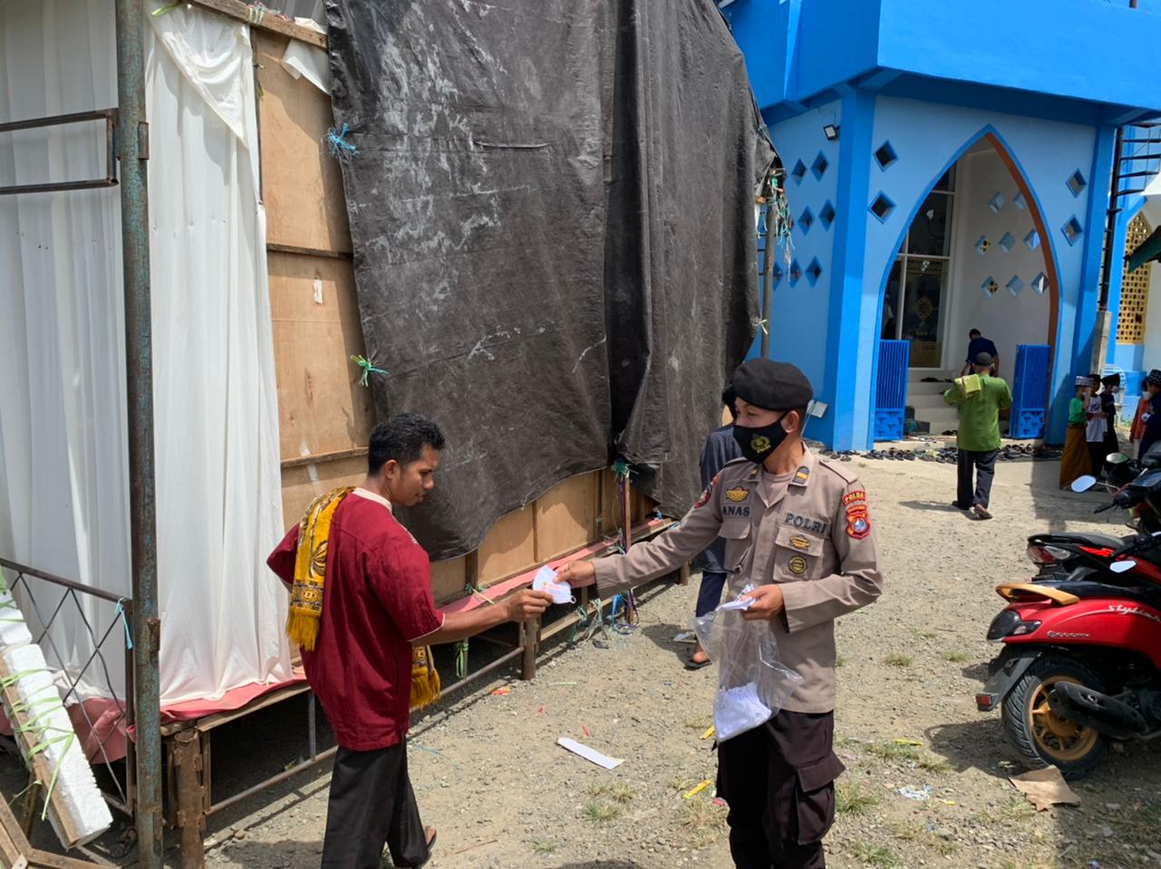 MAMUJU,RAKYATSULBAR.COM-Ratusan lembar masker dibagikan secara gratis oleh Personil Direktorat Pengamanan Objek Vital (Dit Pam Obvit) Polda Sulbar kepada Jamaah Sholat Jumat di Masjid Jami Nurul Anwar dan Masjid Jami Mujahidin Kecamatan Mamuju Kabupaten Mamuju, Jumat (6/8/21).