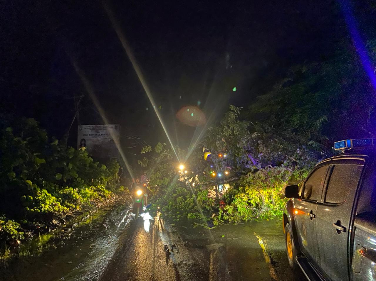 Salah satu pohon besar tumbang menutupi ruas jalan poros trans sulawesi yang menghubungkan Ibu kota Provinsi Sulawesi barat dan Provinsi Sulawesi tengah sehingga terjadi kemacetan arus lalu lintas.