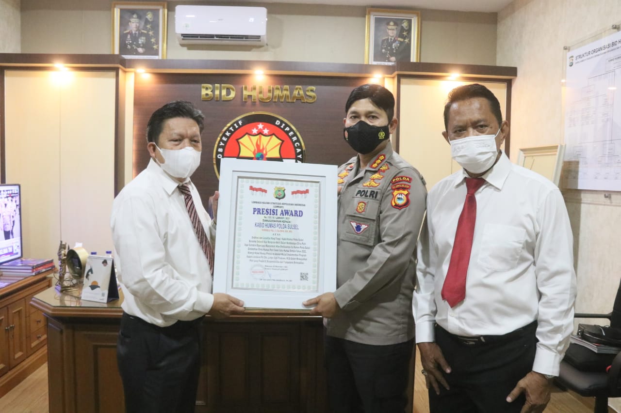 Penghargaan Presisi tersebut diberikan langsung oleh Direktur Eksekutif Lemkapi Dr. Edi Saputra Hasibuan, SH, MH., di Ruang Kerja Kabid Humas Polda Sulsel, Rabu 3 November 2021.