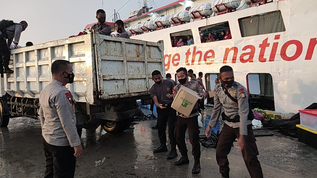 ” Sebelum berangkat dari Mako Brimob Bone, kami lakukan ploting personel menjadi 2 kelompok untuk menempati 2 kecamatan terdampak gempa yaitu Pasimarannu dan Pasilambena. Setelah itu kami langsung bergerak ke pelabuhan penyeberangan Tanjung Bira Bulukumba pada Jum’at sore kemarin. Saat tiba di pelabuhan penyeberangan personel kami langsung memindahkan ribuan paket logistik dari mobil truk ke atas kapal KMP Balibo yang akan tumpangi. Tepat pukul 00.00 Wita kapal kami berangkat meninggalkan Tanjung Bira. Setelah 30 jam berapa di atas laut akhirnya tadi subuh kapal kami sandar di pelabuhan Pasimarannu Bonerate,” ungkap Kompol Nur Ichsan via telepon pagi tadi.