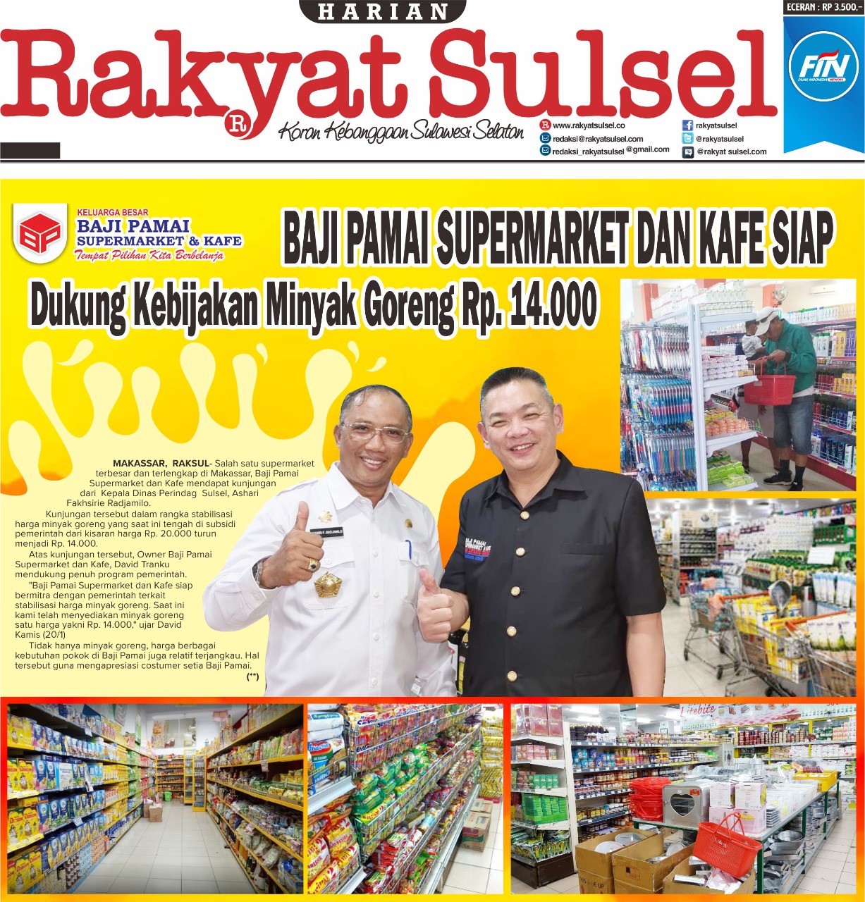 “Baji Pamai Supermarket dan Kafe siap bermitra dengan pemerintah terkait stabilisasi harga minyak goreng. Saat ini kami telah menyediakan minyak goreng satu harga yakni Rp. 14.000,” ujar David Kamis (20/1/22).