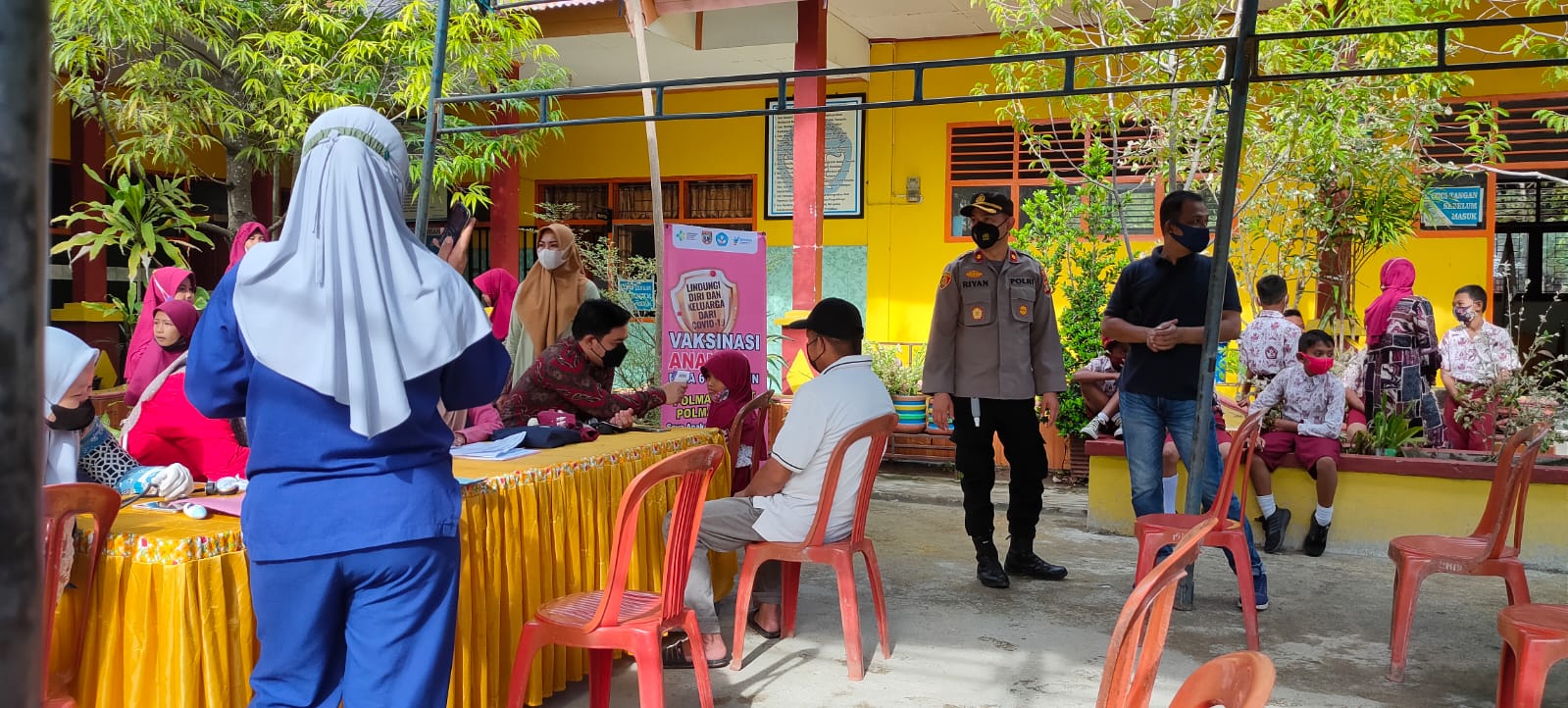 Saat ini Polri bersama instansi terkait lainnya terus melaksanakan Giat Vaksinasi massal demi mendukung program pemerintah dalam menanggulangi penyebaran covid-19, kali ini vaksinasi Untuk Anak usia 6 Sampai 11 tahun diwilayahnya bisa berjalan dengan lancar dan memenuhi target sehingga semua anak bisa ter vaksin semua.
