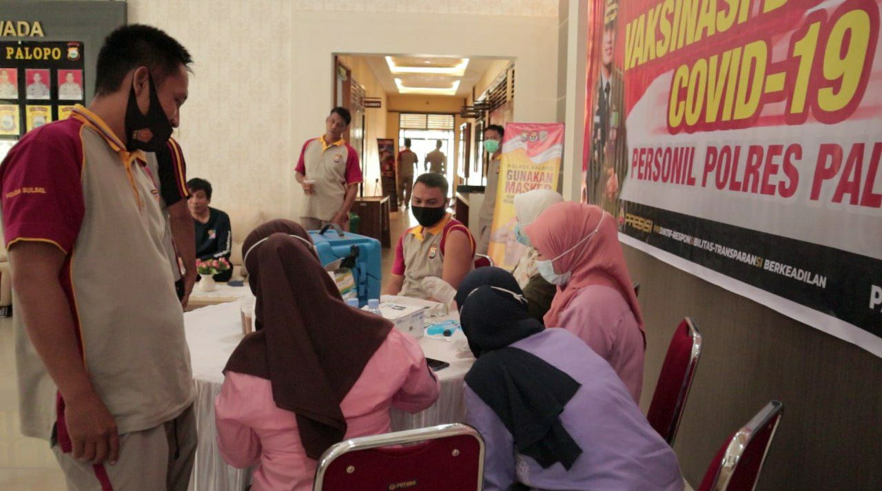 Kapolres Palopo AKBP H. Muh. Yusuf Usman SH/. SIK., MT saat memantau kegiatan Vaksinasi Personil Polres Palopo,mengungkapkan bahwa Vaksin booster disuntikkan terhadap personel Polres Palopo beserta Polsek jajaran, meliputi para pejabat utama (PJU), para kapolsek dan personel Polri maupun Aparatur Sipil Negara (ASN) Polri