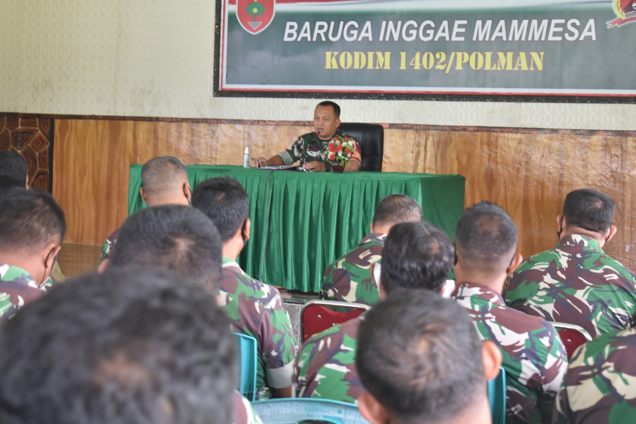 POLMAN,RAKYATSULBAR.COM- Komandan Kodim 1402/Polman Letkol Czi Masni Etha Yanurianedhi, M.Tr.(Han) memberikan jam komandan kepada seluruh prajurt dan ASN TNI di Baruga Mammesa Kodim 1402/Polman, Kabupaten Polewali Mandar, Rabu (23/2/2022).