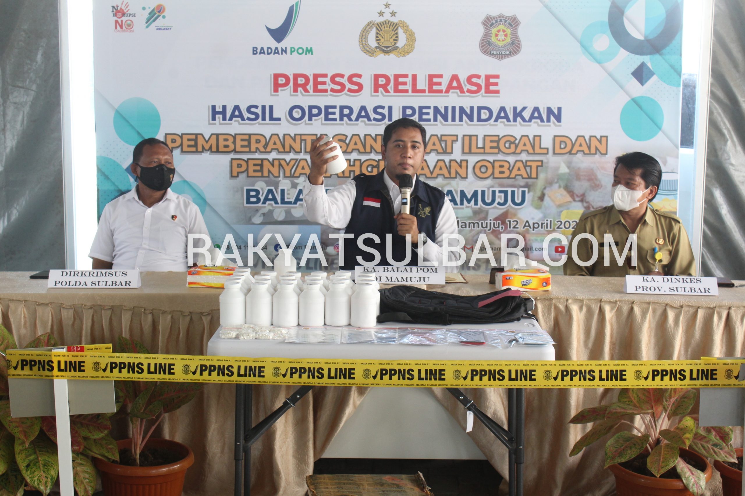 Pres rilis tersebut dipimpin langsung oleh Kepala BPOM Mamuju, Lintang Purba Jaya, Dirkrimsus Polda Sulbar, Kepala Dinas Kesehatan Sulbar.