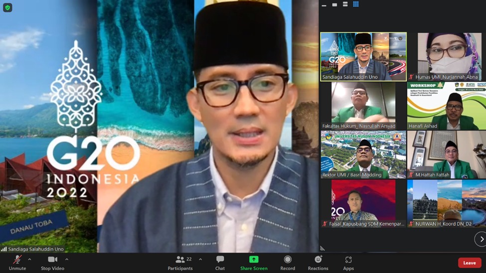 MAKASSAR, RAKYATSULBAR.COM– Silaturrahmi Virtual Menteri Pariwisata dan Ekonomi Kreatif RI, Sandiaga Uno bersama Jajaran Pimpinan Universitas Muslim Indonesia, hadir Rektor UMI, Prof.Dr. H Basri Modding, SE.,MSI dan para Wakil Rektor, Kepala Dinas kebudayaan dan Pariwisata Sulsel, Prof.Dr. Muhammad Jufri, MSi.,Psi.,Psikolog dan jajaran pejabat dalam lingkup Kemenparekraf, Kamis (21/4)