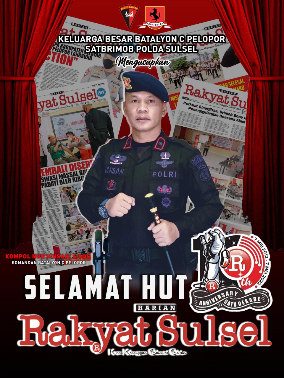 “Saya Kompol Nur Ichsan, Komandan Batalyon (Danyon) C Pelopor Satbrimob Polda Sulsel dan keluarga besar mengucapkan selamat ulang tahun pada harian Rakyat Sulsel yang ke-10 tahun. Satu dekade telah dilalui dengan sangat membanggakan. Teruslah menjadi koran kebanggaan masyarakat Sulawesi Selatan,” kata Kompol Nur Ichsan, Jumat (6/5/2022).