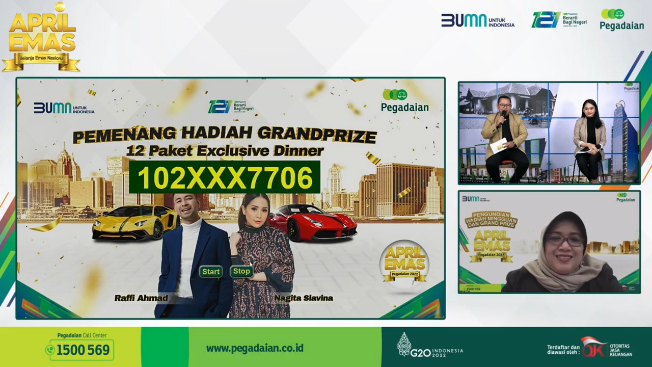 JAKARTA, RAKYATSULBAR.COM— PT Pegadaian umumkan nama 12 orang yang menjadi pemenang dalam Program Pengundian April Emas Pegadaian 2022 pada hari Kamis (12/5). Pengundian Hadiah Undian Mingguan Periode IV dan Grand Prize April Emas Pegadaian 2022 dilaksanakan secara live, ditayangkan di Instagram @sahabatpegadaian, @raffinagita1717, dan Shopee Live Pegadaian.