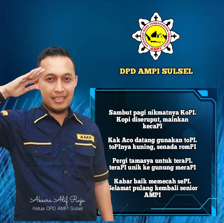 “Sambut pagi nikmatnya kopi, kopi diseruput mainkan kecapi. Kak Aco datang gunakan topi, topinya kuning senada rompi. Pergi tamasya untuk terapi, terapi unik ke gunung merapi. Kabar baik memecah sepi, selamat pulang kembali senior AMPI,” tulis Alif selaku ketua DPD AMPI Sulsel itu kepada awak media, Sabtu (28/5/2022).