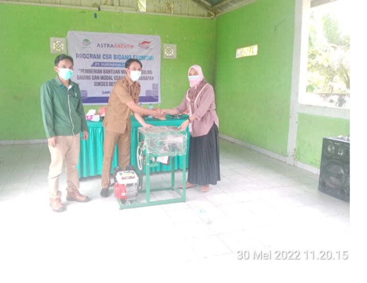 PT. Suryaraya Lestari 1 (PT SRL1) memberikan bantuan mesin penggiling daging dan bantuan modal usaha untuk menunjang peningkatan produksi UKM “HARAPAN SUKSES” di Desa Sapurang, kecamatan Sapurang Kabupaten Pasangkayu, Senin (30/5/2022).
