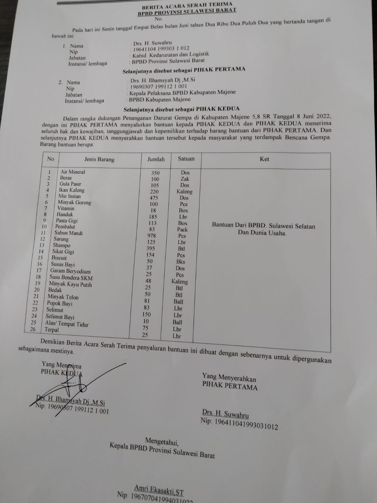 Berikut bantuan yang terima BPBD Majene yang bersumber dari Pemprov Sulsel :