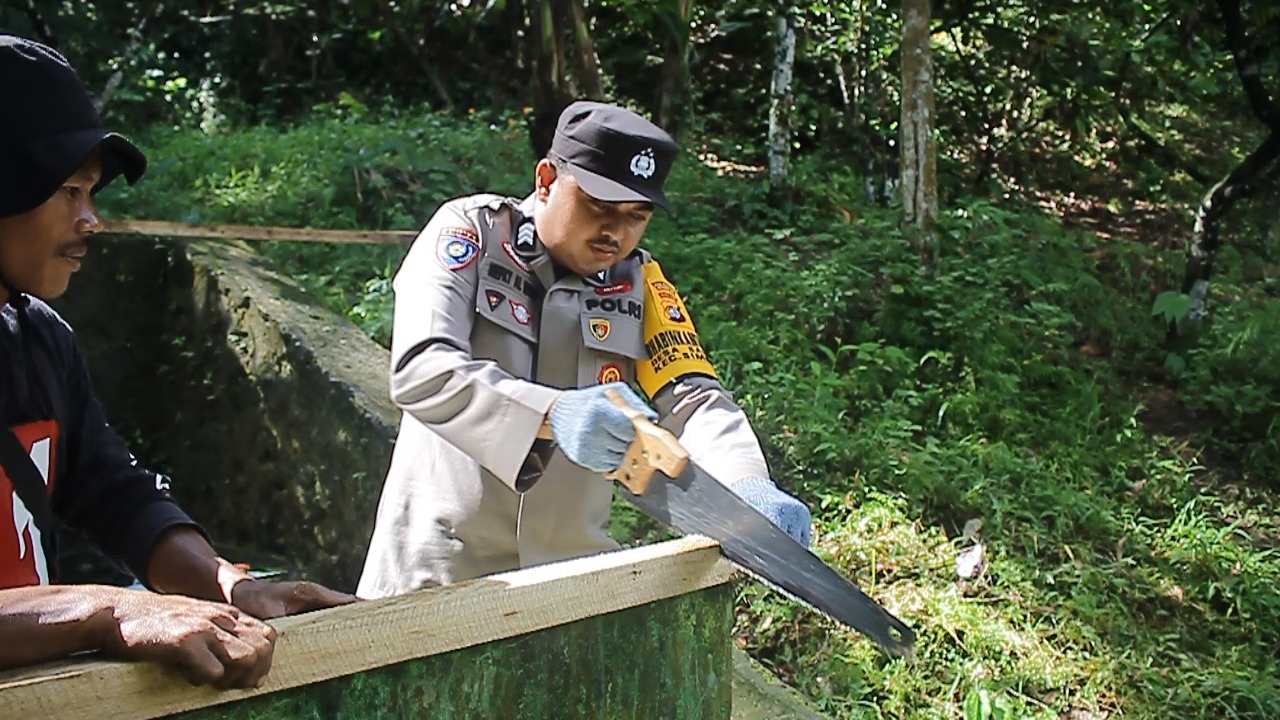 Brigpol Rifky dan beberapa warga setempat hanya menggunakan papan kayu, serta material sederhana lainnya untuk membangun MCK tersebut.