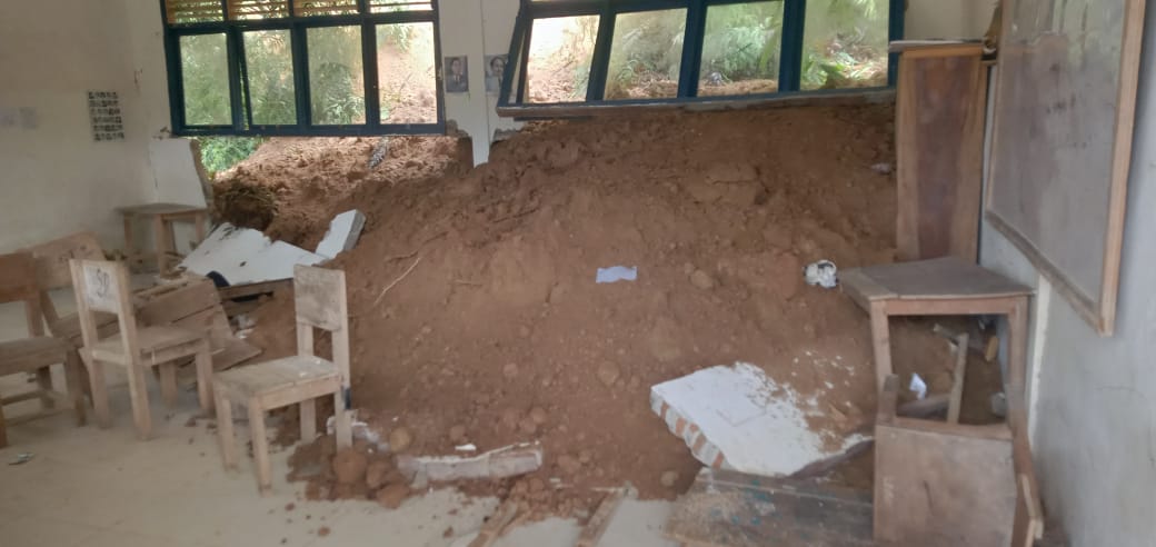 “Beberapa hari yang lalu terjadi hujan lebat dalam waktu yang lama, bukit di samping gedung sekolah longsor dan menimpa ruang belajar siswa. Satu kelas rusak berat, satu kelas rusak ringan, buku, lemari, meja dan kursi ikut tertimbun, ” tutur Ayub di Kalabak, Jumat (8/7) 2022.