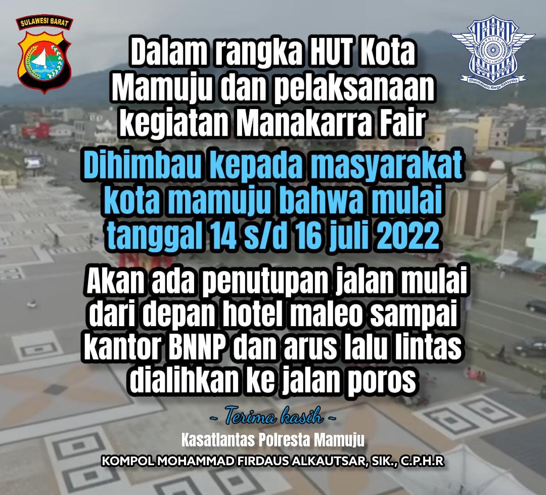 Demi memeriahkan dan menyukseskan acara Manakarra Fair 2022, Kasat lantas Polresta Mamuju Polda Sulbar, akan melaksanakan pengaturan dan pengamanan jalur pada setiap persimpangan serta paling utama akan dilakukan penutupan dan pengalihan arus lalu lintas sekitar Anjungan Pantai Manakarra Mamuju.