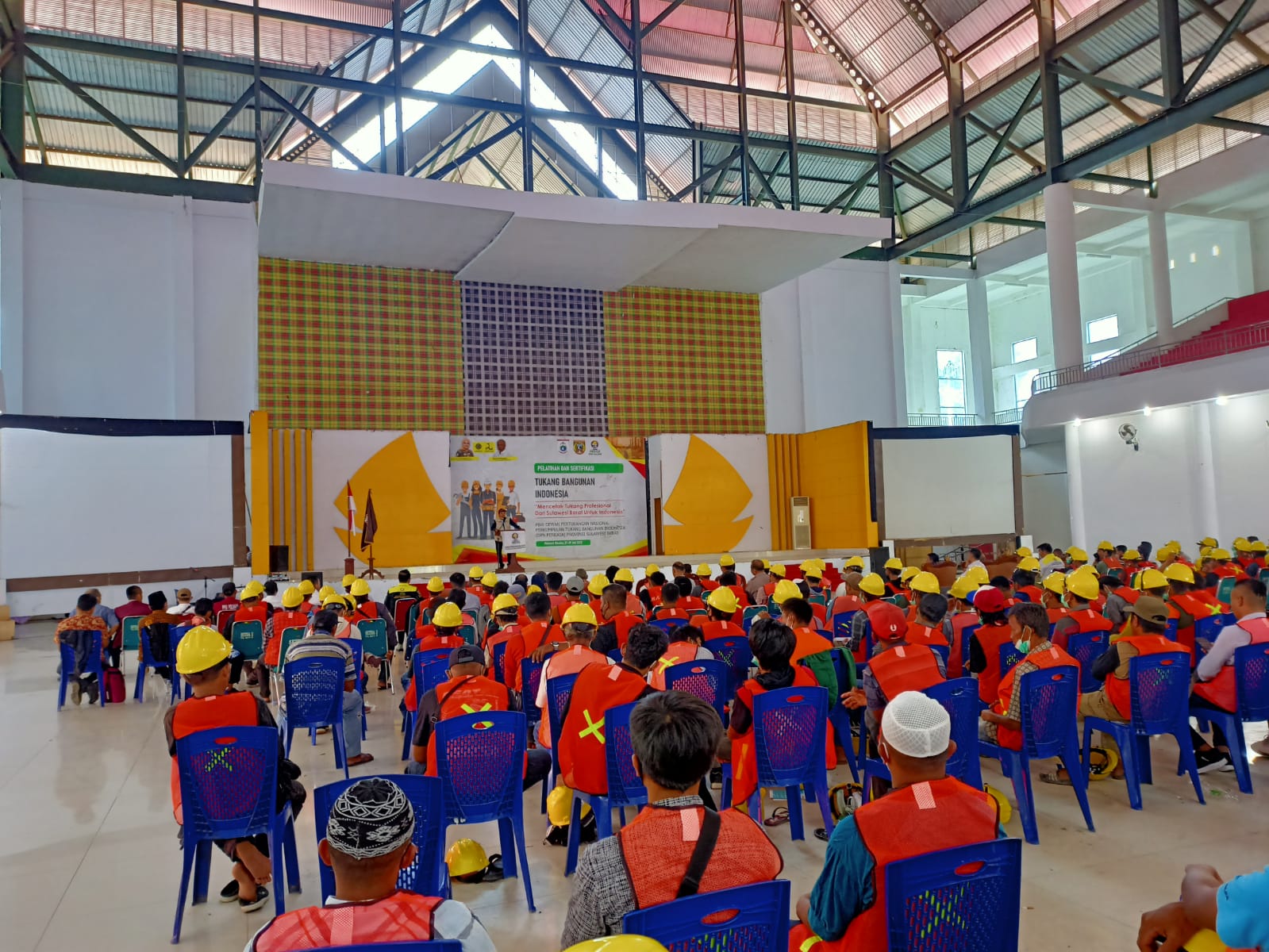 POLMAN, RAKYAT SULBAR.COM –– Ratusan tukang bangunan Sulawesi Barat (Sulbar) mengikuti pelatihan dan sertifikasi, yang digelar oleh Dewan Pertukangan Nasional (DPN Perkasa) Provinsi Sulbar, di gedung Gadis, Kelurahan Darma, Kecamatan Polewali, Kabupaten Polewali Mandar (Polman), Rabu, (27/7/2022).