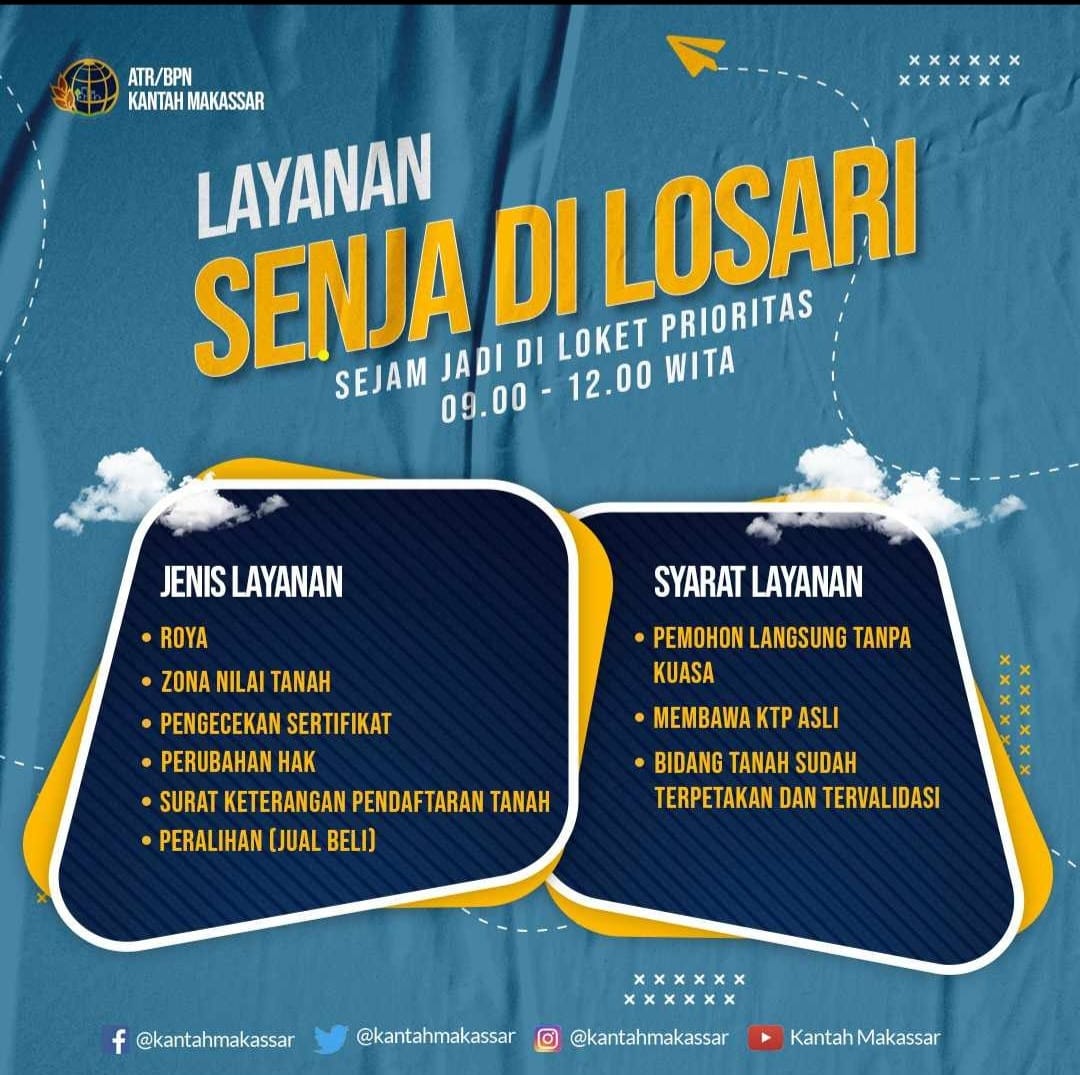 Oleh sebab itu, ATR/BPN Makassar, memprogramkan layanan “Senjan Losari” bagi masyarakat umum yang hendak mengurus sertipikat tanah hingga perubahan hak alas.