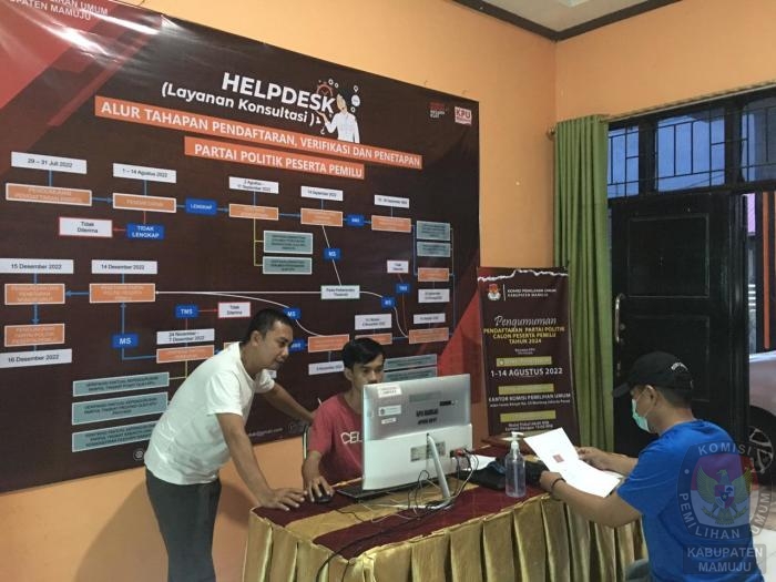 MAMUJU, RAKYATSULBAR.COM – Komisi Pemilihan Umum (KPU) Kabupaten Mamuju membuka Layanan Konsultasi (HelpDesk) sejak dibukanya Pendaftaran Partai Politik Peserta Pemilu 2024. Layanan HelpDesk ini dibuka di Kantor KPU Kabupaten Mamuju Kompelks Perumahan Graha Nusa.