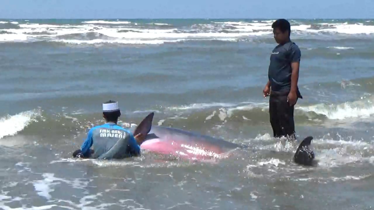 Warga setempat sudah berupaya untuk menyelamatkan ikan paus tersebut kembali ke laut, namun kesulitan karena gelombang tinggi dan ikan tersebut kelihatan tidak kuat.
