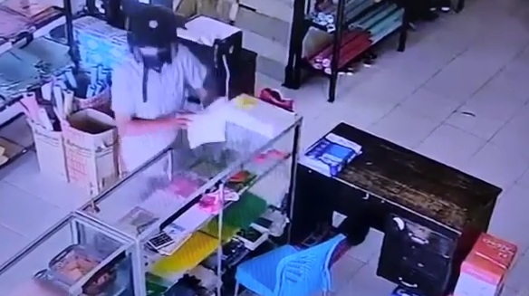 Dimana terlihat seorang pria yang mengenakan kaos putih dan helm hitam dengan membawa selebaran kertas memakai masker, terekam CCTV kamera pengawas dengan sangat lincah mengambil satu unit Hp miliki salah satu karyawan Foto Copy Aulia, Wulansari, yang sedang bekerja bersama satu orang temanya.
