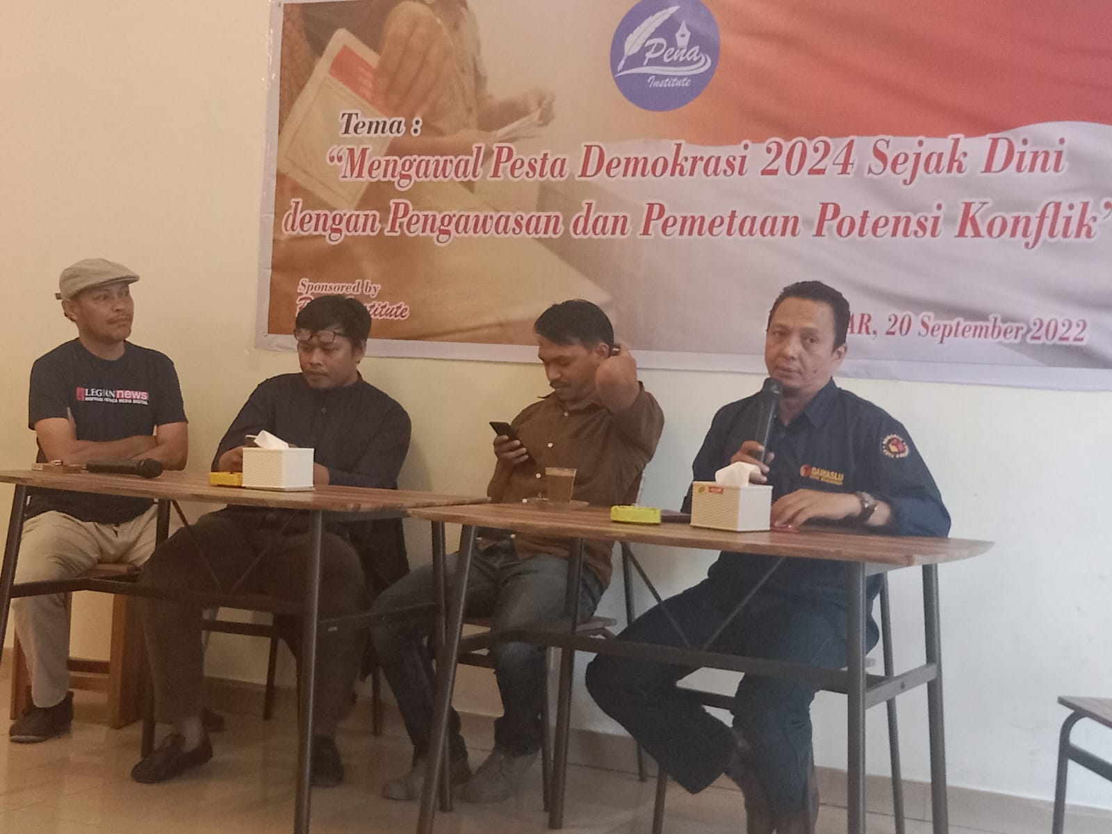 MAKASSAR, RAKYATSULBAR.COM – Lembaga Pena Institut menggelar kegiatan diskusi publik bertajuk “Mengawal Pesta Demokrasi 2024 Sejak Dini Dengan Pengawasan dan Pemetaan Potensi Konflik di Warkop Sama, Jalan Topaz, Makassar, Selasa (20/9/22).