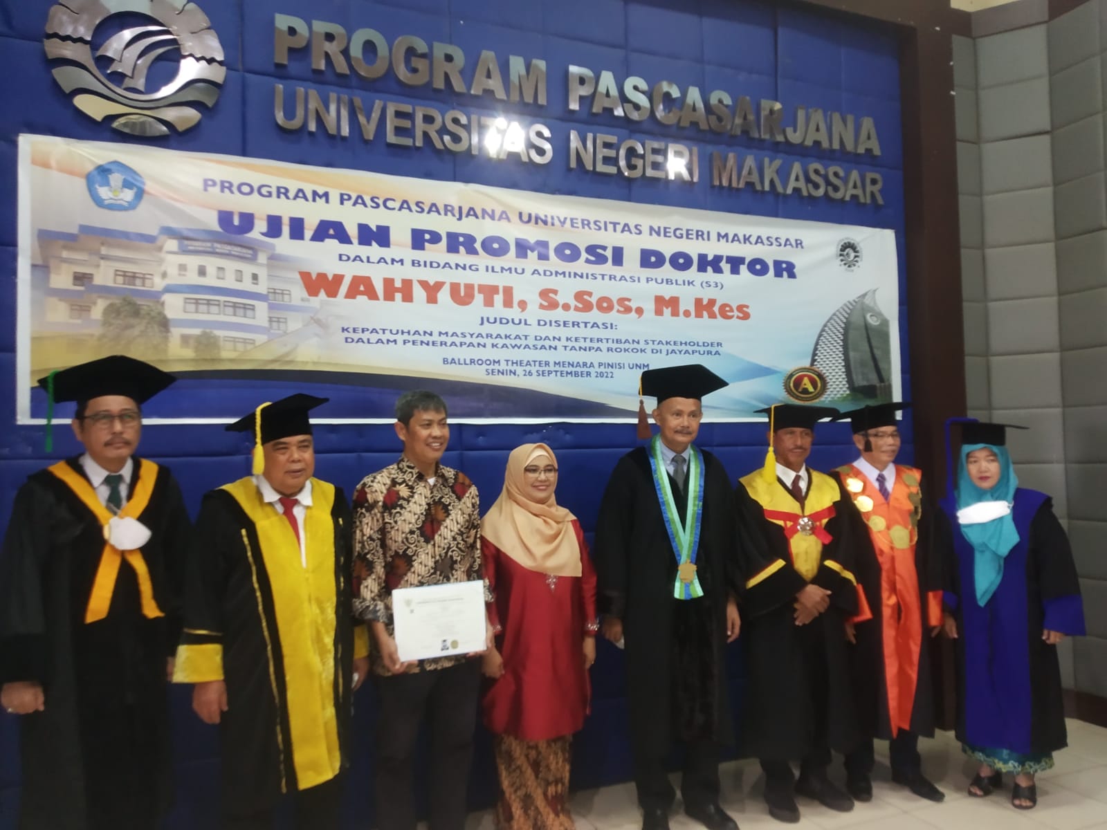 Dengan judul disertasi ‘Kepatuhan Masyarakat dan ketertiban Stakeholder dalam penerapan Kawasan Tanpa Rokok di jaya pura’Wahyuni meraih predikat Sangat Memuaskan.