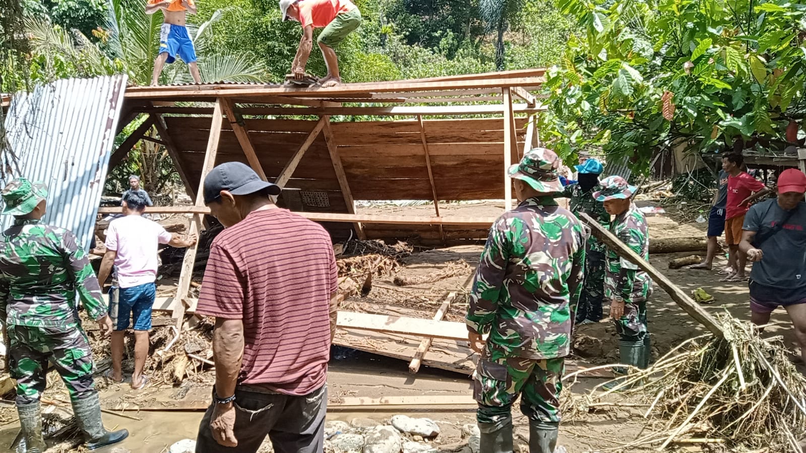 Puluhan anggota TNI dari Kodim 1402/Polman bersama warga sekitar membantu masyarakat membersihkan sisa lumpur, batu, kayu, dan sampah yang masuk ke rumah warga.