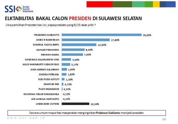 MAMUJU, RAKYATSULBAR.COM – Lembaga survei Script Survey Indonesia (SSI) merilis hasil temuan di lapangan terkait elektabilitas calon presiden Republik Indonesia di wilayah Sulawesi Selatan. Survei yang dilakukan tanggal 5 hingga 25 September 2022.