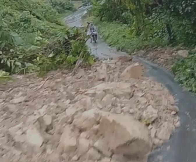 MAMUJU, RAKYATSULBAR.COM- Akses jalan Poros Sese, Kelurahan Rangas, Kecamatan Simboro, Kabupaten Mamuju, Sulawesi Barat tertutup material longsor, Kamis (27/10/22).