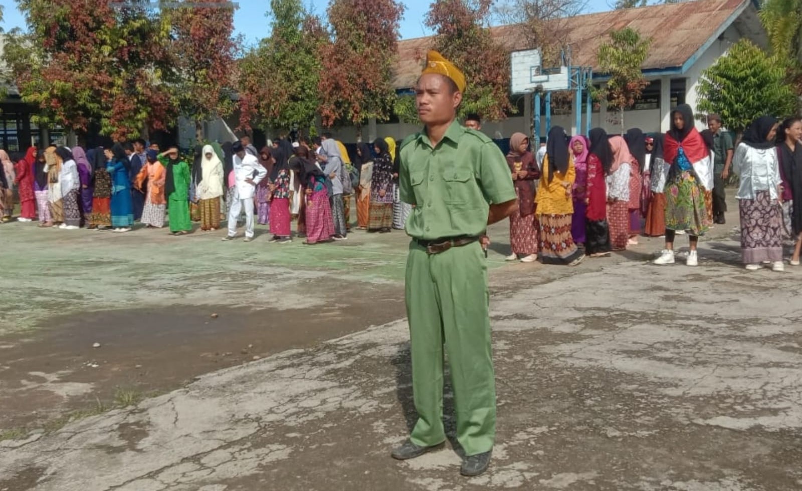 Dimana sejumlah guru bersama dengan mahasiswa KKN berseragam tidak seperti biasanya sebagai seorang pendidik, mereka terlihat memakai kostum berbeda-beda mulai dari busana ala Kartini tempo dulu hingga Veteran pejuang.