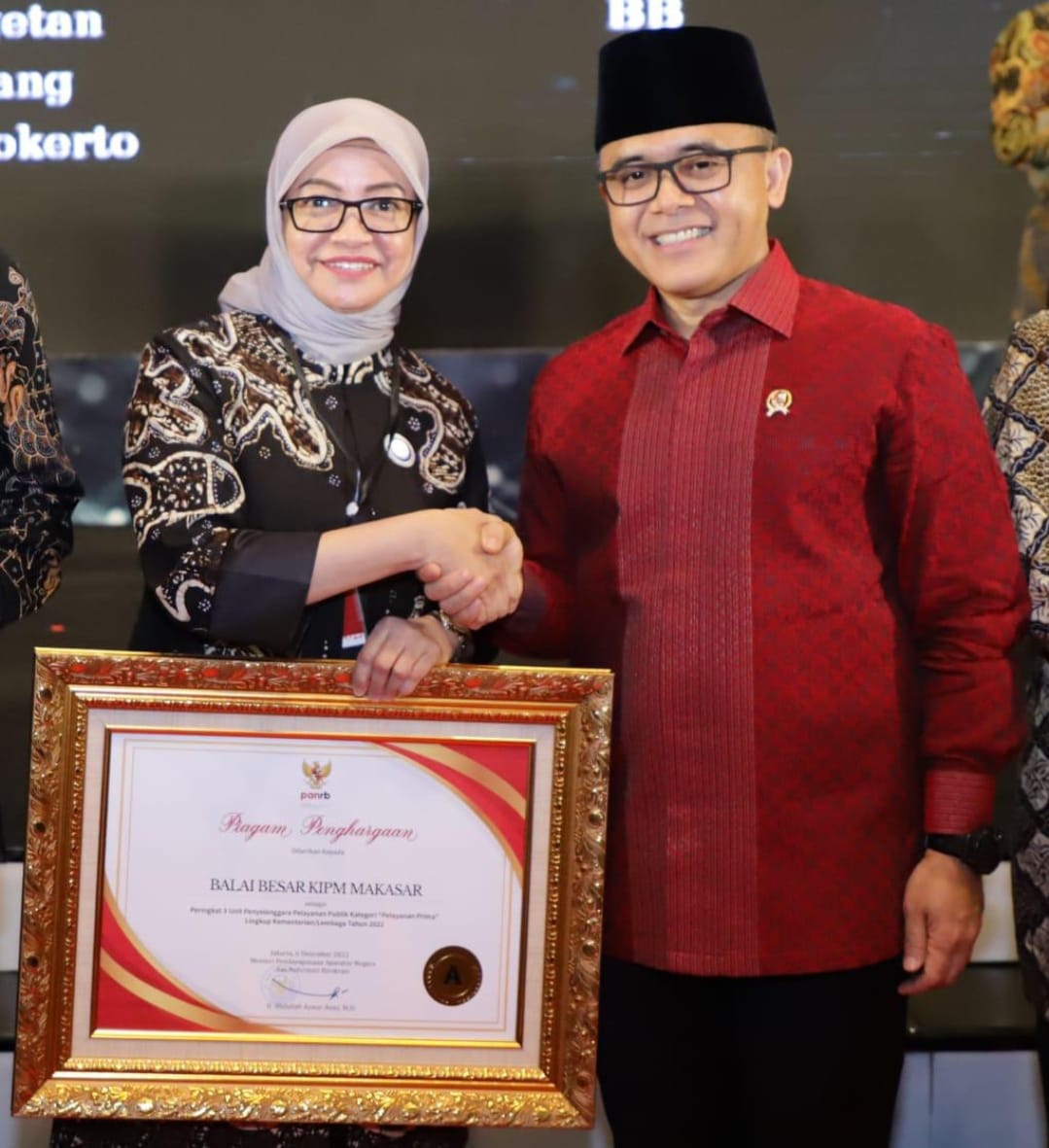 Pada tahun 2022 ini BKIPM Makassar yang ditunjuk untuk mewakili Kementerian Kelautan dan Perikanan berhasil masuk dalam TOP 3 Unit Penyelenggara Pelayanan Publik Kategori Pelayanan Prima Lingkup Kementerian/Lembaga dan mendapat penghargaan dari Menteri PAN RB Bapak H. Abdullah Azwar Anas, M.Si.