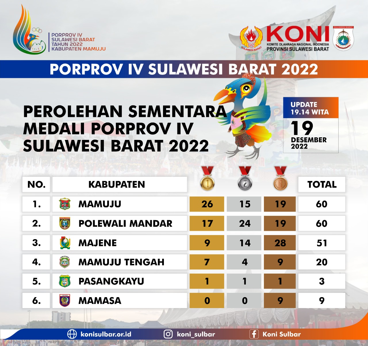 MAMUJU, RAKYATSULBAR.COM – Hasil perolehan sementara Medali pada Pekan Olahraga Provinsi Sulawesi Barat tahun 2022 yang di pusatkan di Kabupaten Mamuju per tanggal 19. Desember 2022.