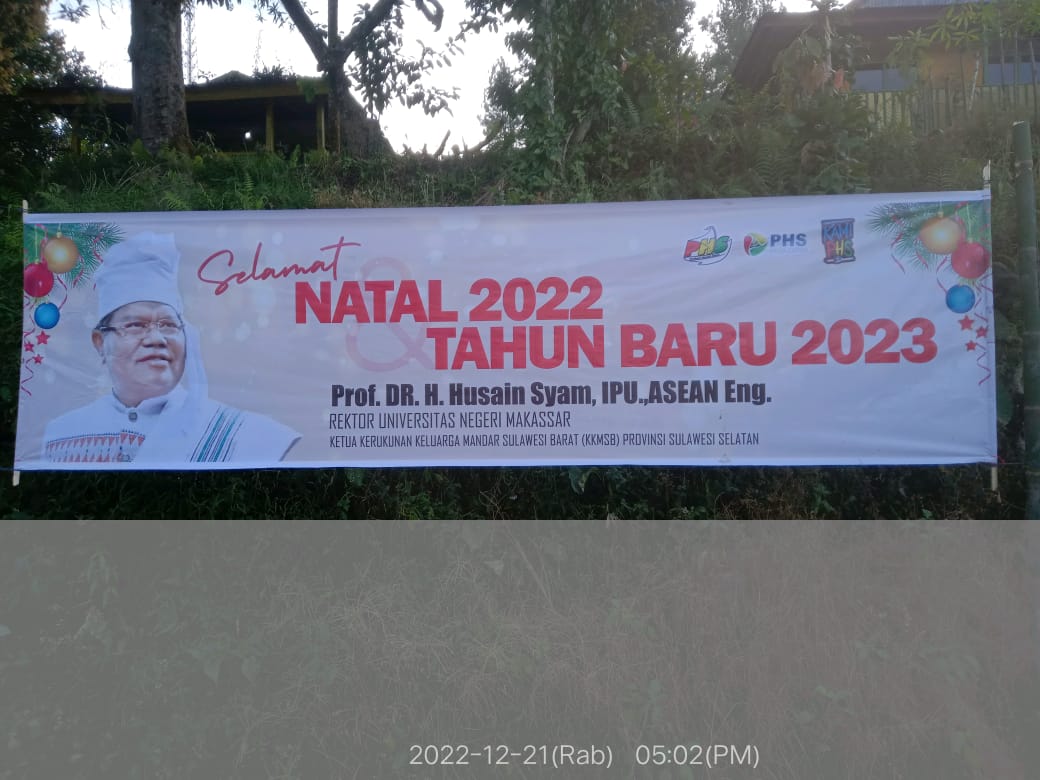 MAMASA, RAKYATSULBAR.COM – Spanduk ucapan selamat natal 2022 dan tahun baru 2023 dari Prof Husain Syam (PHS) beredar massif di Kabupaten Mamasa. Putra Sulbar yang sukses memimpin Universitas Negeri Makassar (UNM) tersebut, tampil khas dengan pose baju adat Mamasa dalam atributnya.