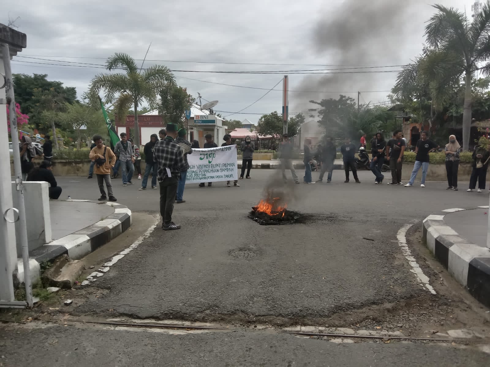 Dalam aksinya, massa memenuhi pintu masuk kantor bupati, sembari membentangkan spanduk dan membakar ban bekas sebagai bentuk protes dan perlawanan terhadap kinerja pemerintah daerah.