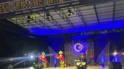Terlihat Sanggar Prasbhara menampilkan tari Sayo Kalumpang lengkap dengan pakaian adat Kalumpang, Kabupaten Mamuju, Provinsi Sulawesi Barat.